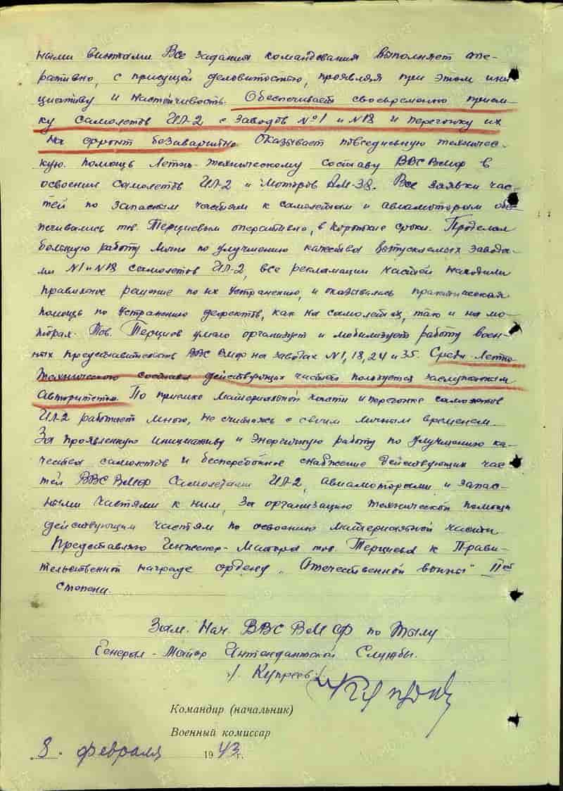 08.02.1943 районный инженер 4-го отдела Управления тыла Главного управления ВВС ВМФ инженер-майор Терциев В.А. представлен к награде.