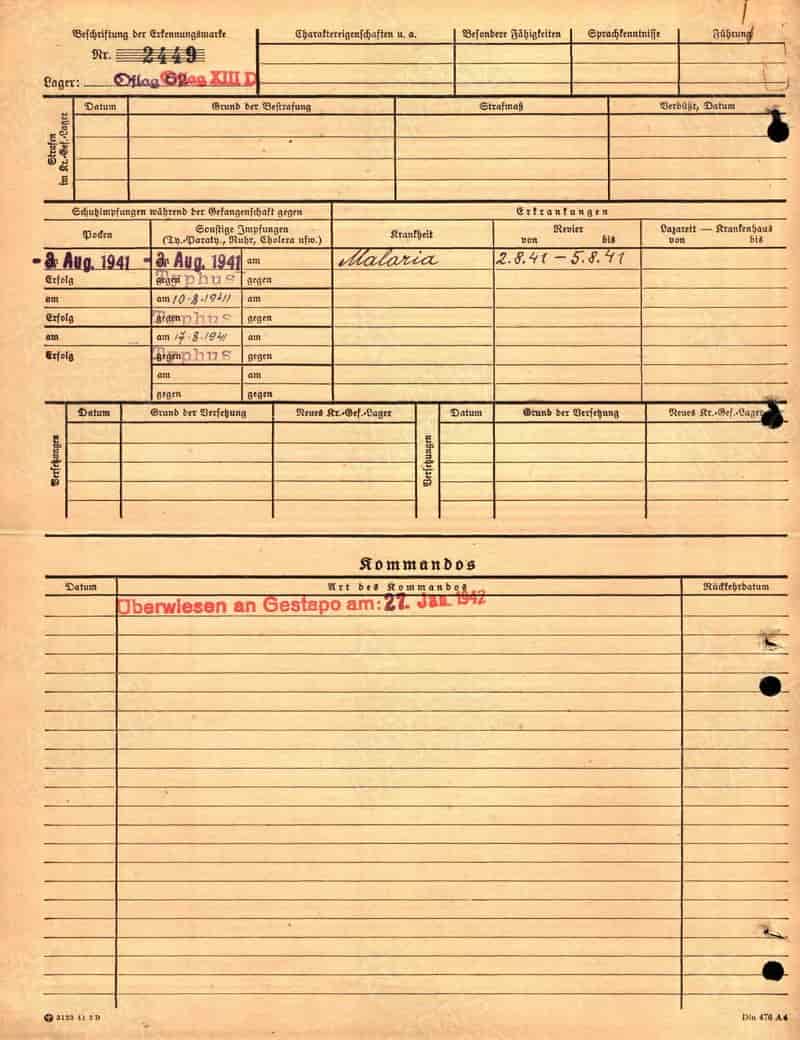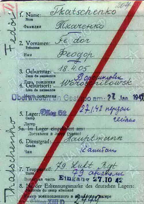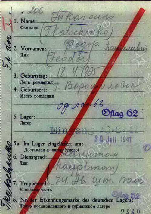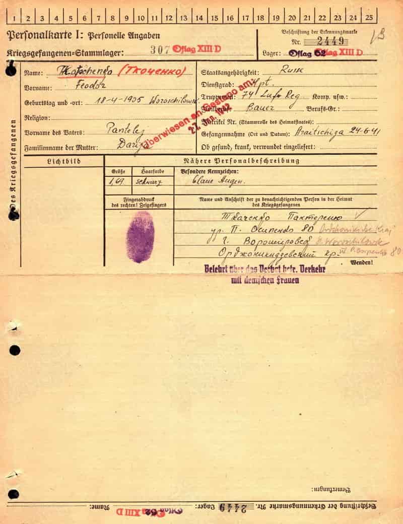 Находился в немецком плену в концентрационном лагере Oflag-XIII D (Oflag XIII D Hammelburg) г. Хаммельбург Бавария. Лагерный № 2449.