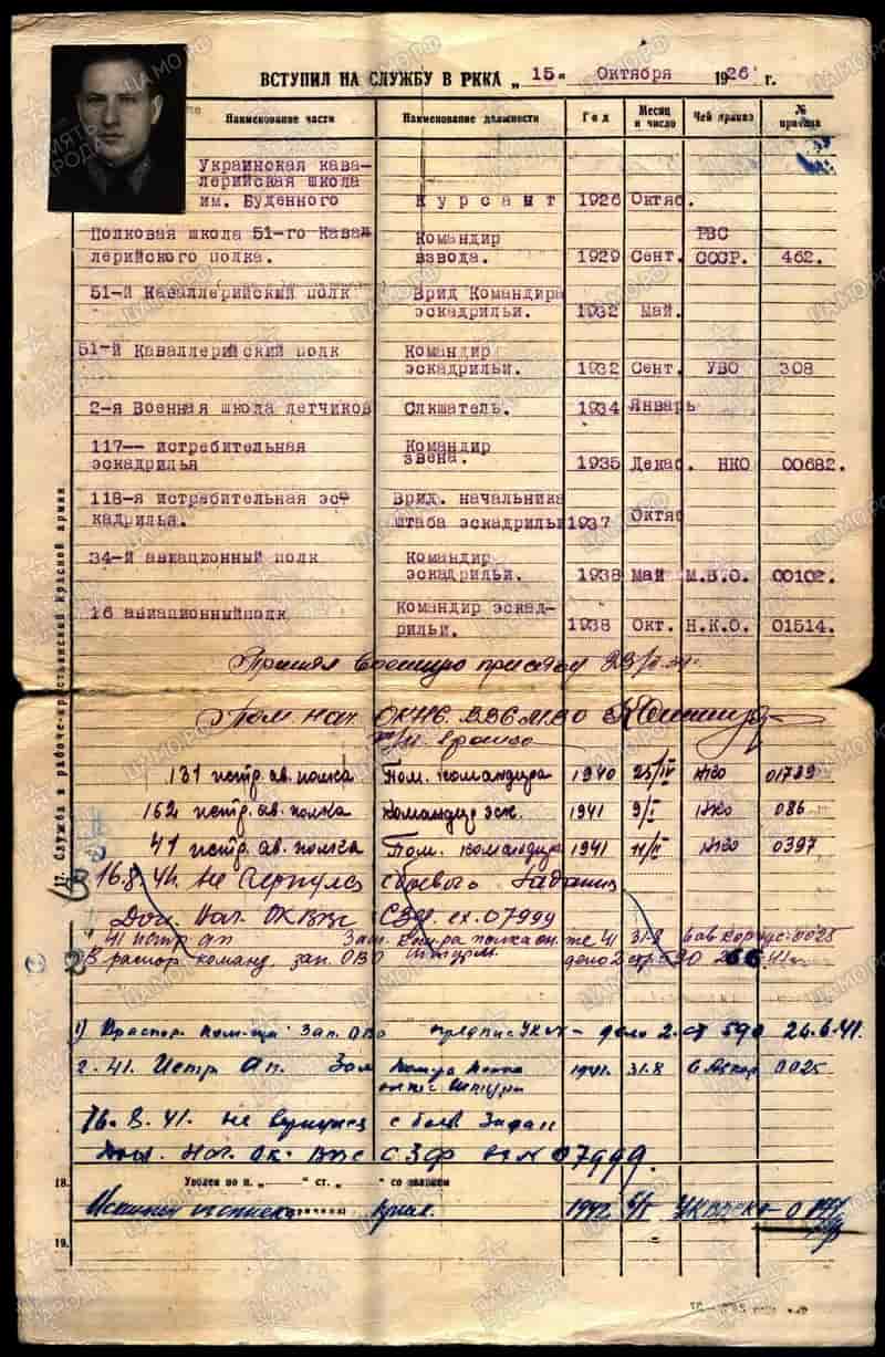 Выпускник 1935 года 2-й (Борисоглебской) Краснознамённой школы лётчиков имени Осоавиахима СССР. В проекте приказа указан профиль истребительная авиация, 117 иаэ.