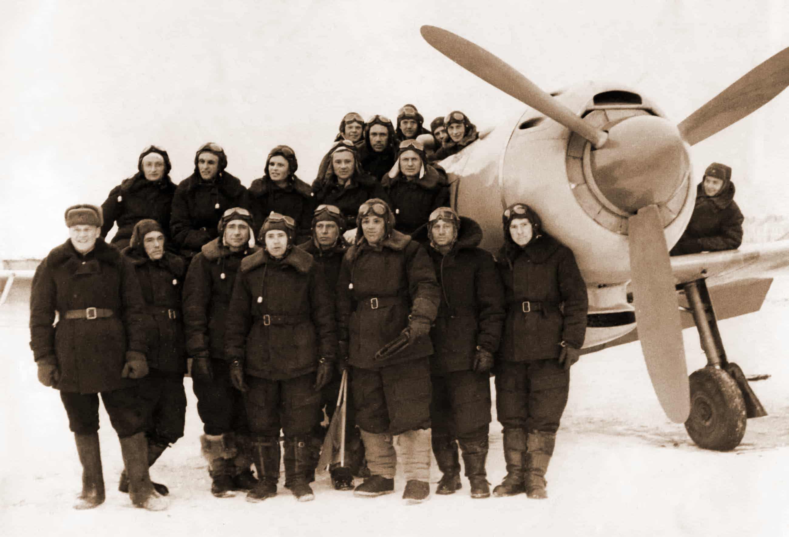 На фото: Поворино, март 1952 г. Слева направо: 1-й ряд: полковой врач; Захаров А., Калинский, командир звена Феоктистов И.С., Каниболотский И., Голиков А.И., Коробейников В., Ильин; 2-й ряд: Вавилин Г., Свешников, Меркулов А., Берзин, Коршунов, Кузнецов; 3-й ряд – курсанты.