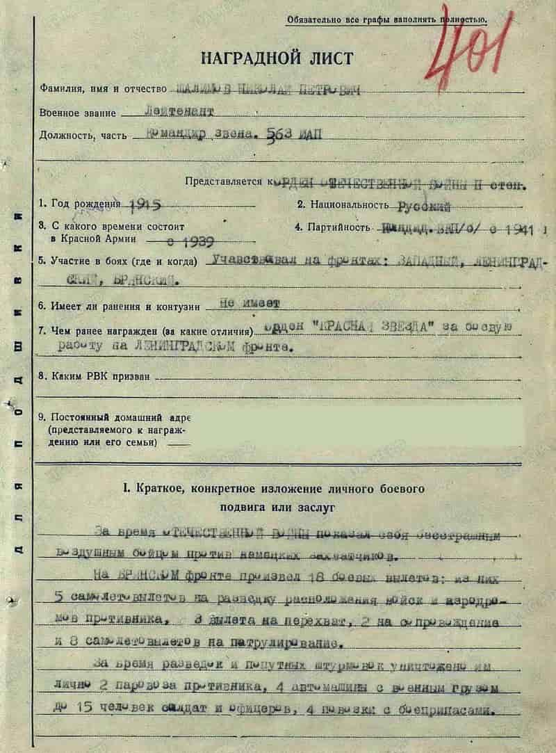 30.05.1942 командир звена 563 иап 205 иад 205 иад Брянского фронта лейтенант Шалимов Н.П. представлен к награждению орденом Отечественной войны II степени, 06.06.1942 награждён орденом Красного Знамени.