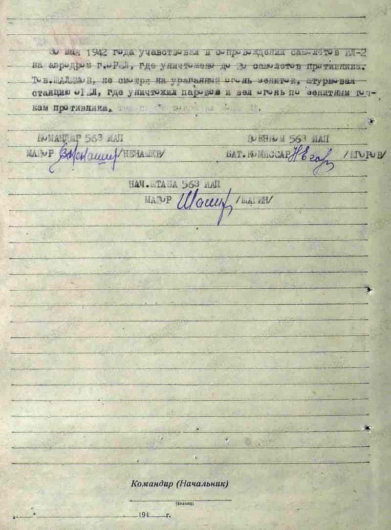 В дальнейшем младший лейтенант Шалимов Н.П. назначен лётчиком 563-го иап. Сведений о назначении на должности не найдено.