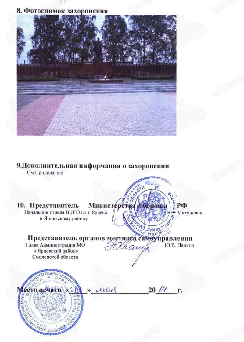 Есть в списках захороненных в Братской могиле № 2-27 п. Яковлево Ярцевского района Смоленской области (захоронение № 89374330).