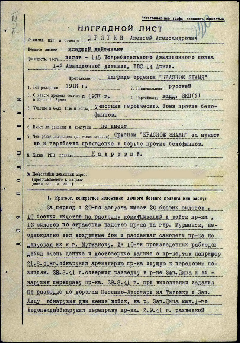 23.09.1941 года пилот 145-го иап младший лейтенант Дрягин А.А. представлен к награждению и 03.01.1942 награждён орденом Красного Знамени.