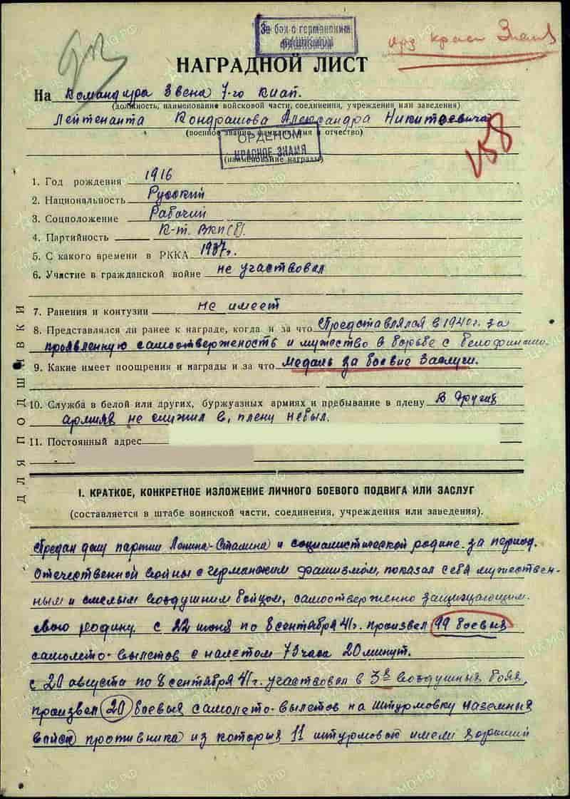 17.09.1941 года командир звена 7-го иап лейтенант Кондрашёв А.Н. представлен к награждению орденом Ленина. 26.11.1942 посмертно награждён орденом Красного Знамени.