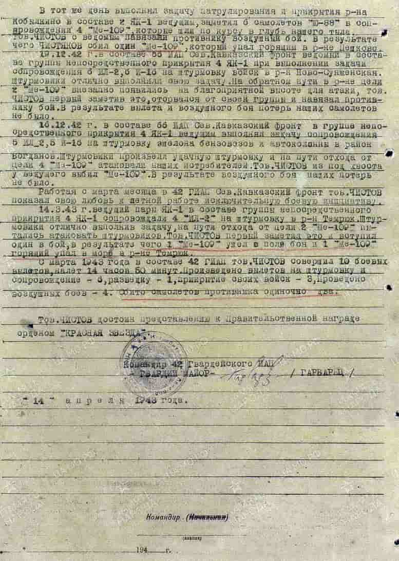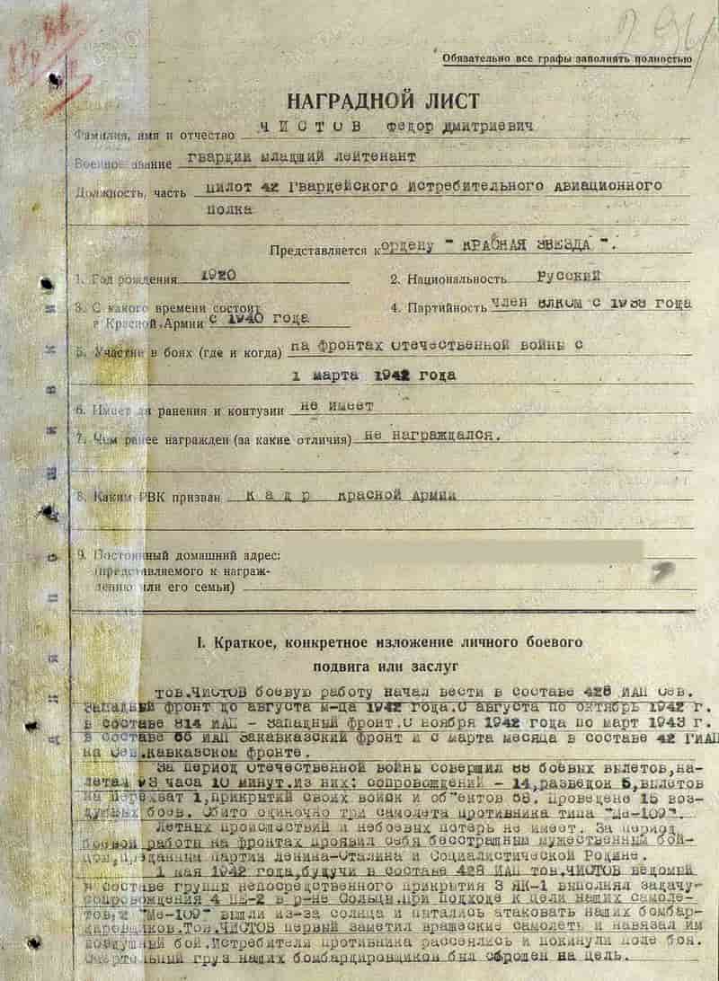 14.04.1943 пилот 42 гиап гвардии младший лейтенант Чистов Ф.Д. представлен к награде.