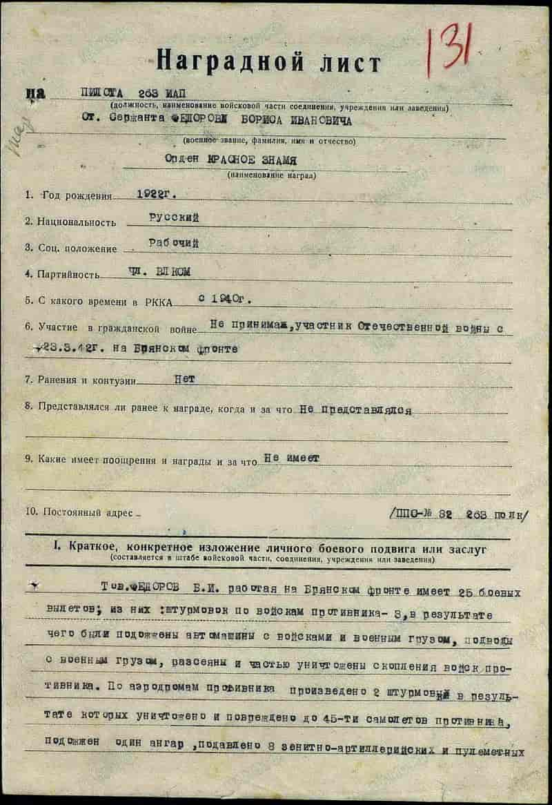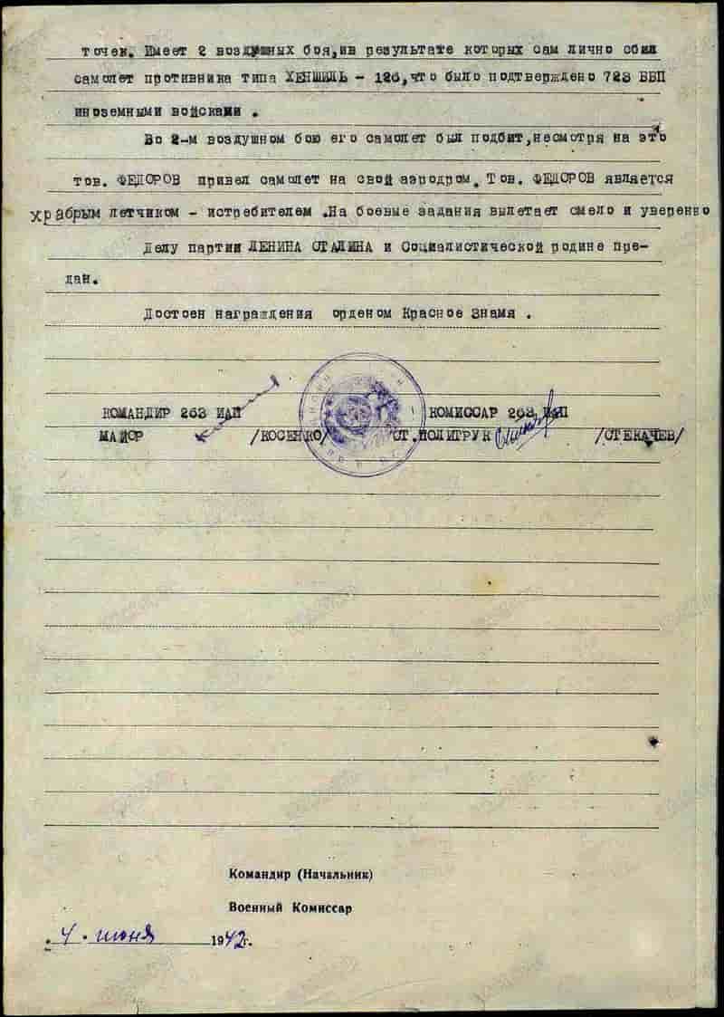 04.06.1942 пилот 263 иап старший сержант Фёдоров Б.И. представлен к награждению ордену Красного Знамени и 23.06.1942 посмертно награждён орденом Красной Звезды.