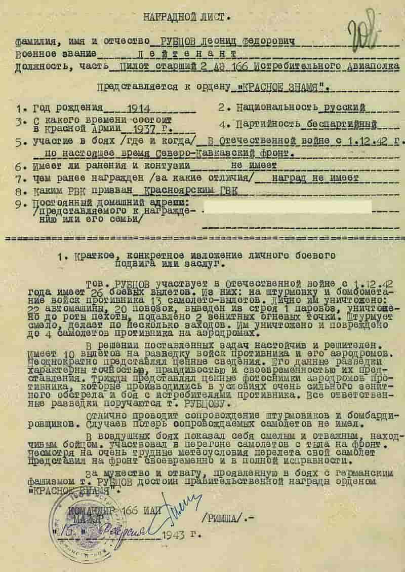15.02.1943 пилот старший 2-й эскадильи 166 иап лейтенант Рубцов Л.Ф. представлен к награждению и 20.02.1943 награждён орденом Красного Знамени.