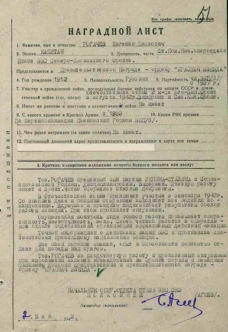 02.05.1943 старший помощник начальника оперативного отдела штаба ВВС Северо-Кавказского фронта капитан Рогачёв Е.П. представлен к награждению и 14.05.1943 награждён орденом Красной Звезды.