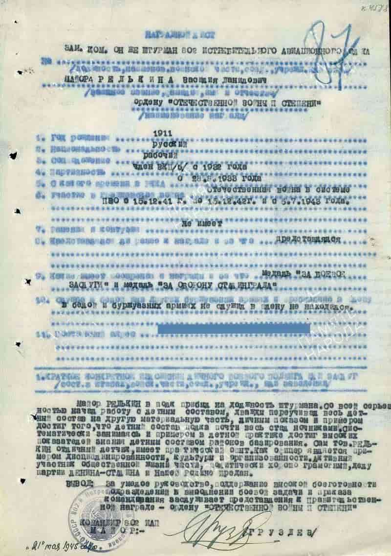 21.05.1945 заместитель командира, штурман 802 ПВО иап майор Редькин В.Д. представлен к награждению и 29.06.1945 награждён орденом Отечественной войны II степени.