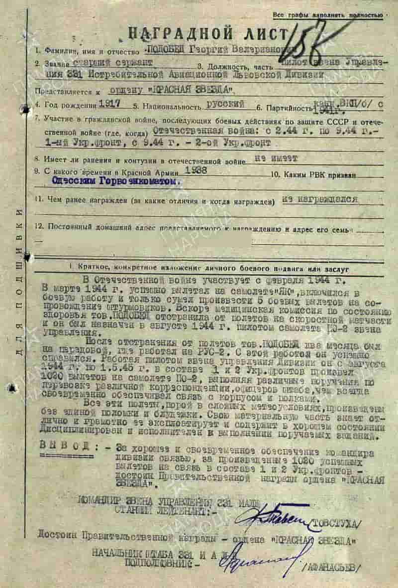 21.05.1945 пилот звена управления 331 иад старший сержант Подобед Г.В. представлен к награждению и награждён орденом Красной Звезды.