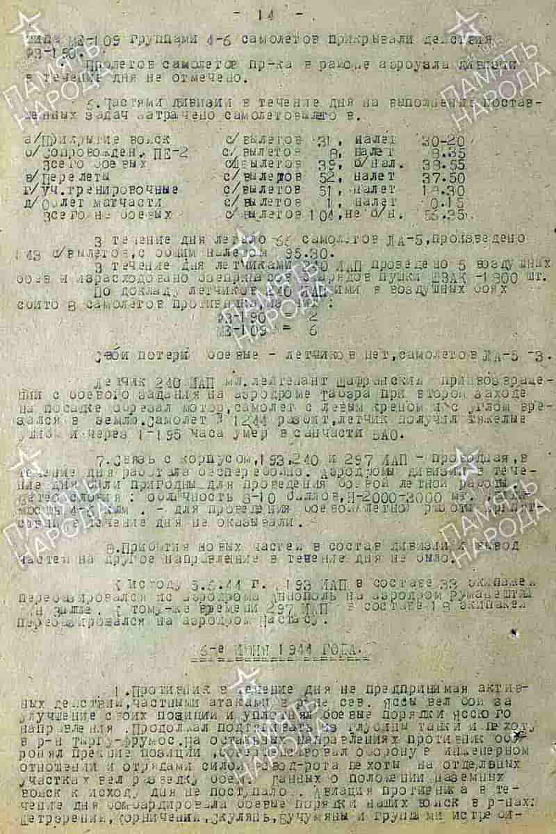 Скан страницы из Журнала боевых действий 240 иап по 302 иад за июнь 1944: