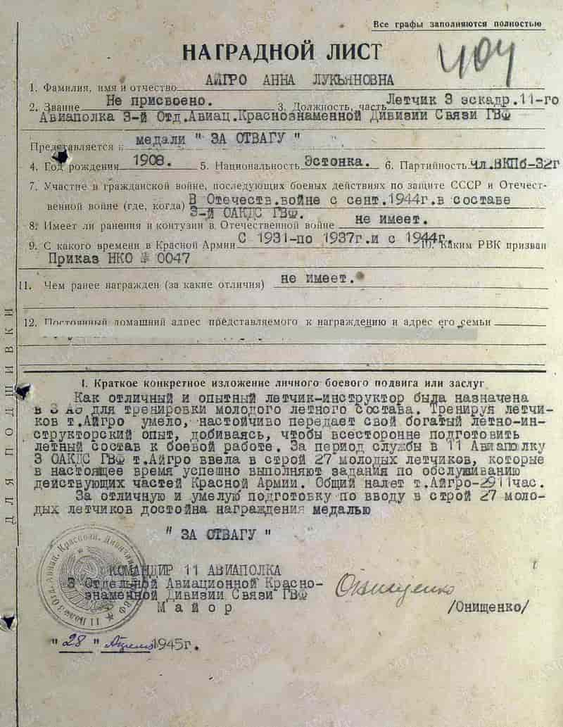 28.04.1945 лётчик 3-й авиаэскадрильи 11-го авиаполка 3-й ОАДС Айгро Анна Лукьяновна представлена и 30.04.1945 награждена медалью «За боевые заслуги».