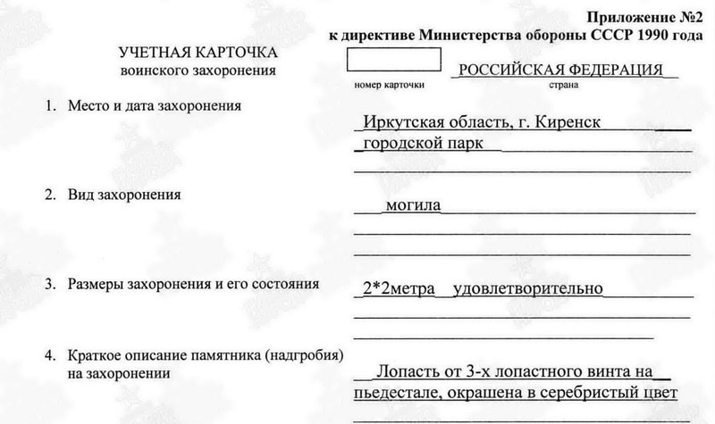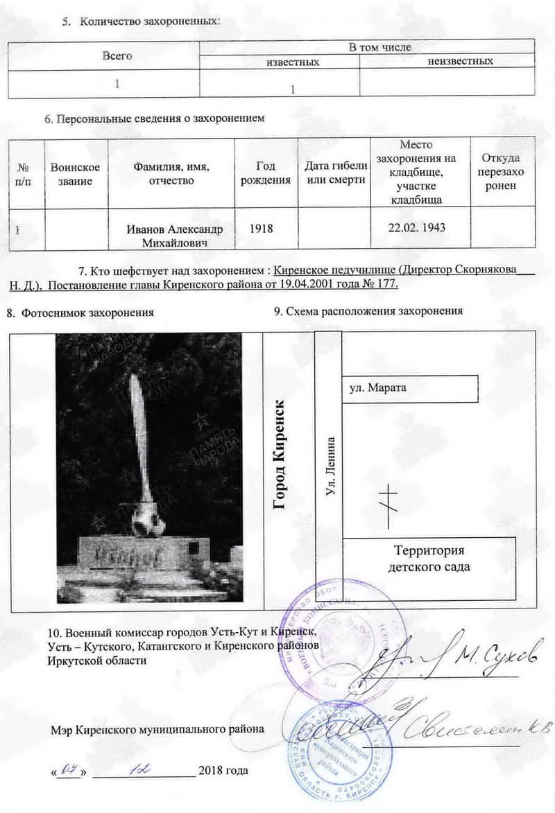 Похоронен в одиночной могиле в городском парке г. Киренска Киренского района Иркутской области.