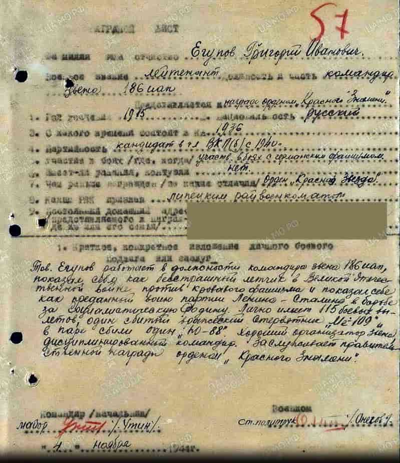04.11.1941 командир звена 186 иап лейтенант Егунов Г.И. представлен к награждению и 06.11.1941 награждён орденом Красного Знамени.