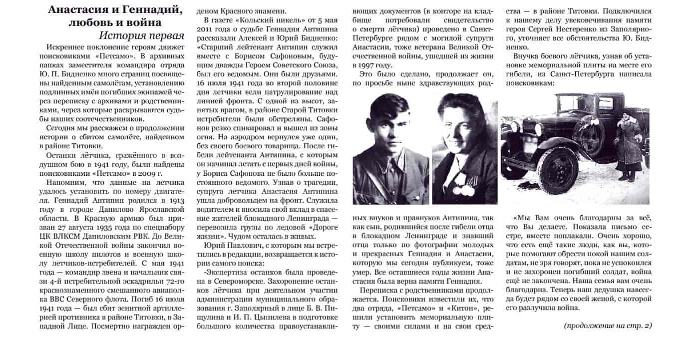...После того, как поисковики установили по номеру самолёта, кто погиб на нём и все обстоятельства последнего полёта Геннадия Антипина, заместителю командира поискового отряда Юрию Бидненко удалось разыскать родственников погибшего. Уже не было в живых Анастасии Фёдоровны, она скончалась в 1977 году в возрасте 58 лет. Умер и сын, родившийся после гибели отца и знавший его только по фотографиям.