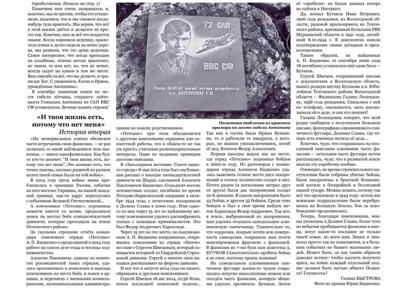 В Санкт-Петербурге нашлись внучки погибшего североморского лётчика. После проведённой экспертизы найденных на месте падения самолёта останков и оформления многочисленных документов Геннадий Антипин был похоронен рядом с могилой жены Анастасии. Разлученные на долгие десятилетия войной, теперь они навсегда вместе. А на месте падения самолёта И-16 и гибели Геннадия Антипина поисковики установили памятную доску.