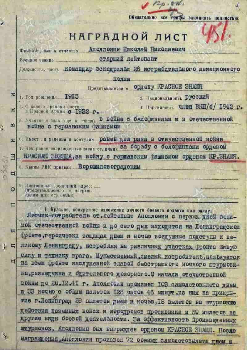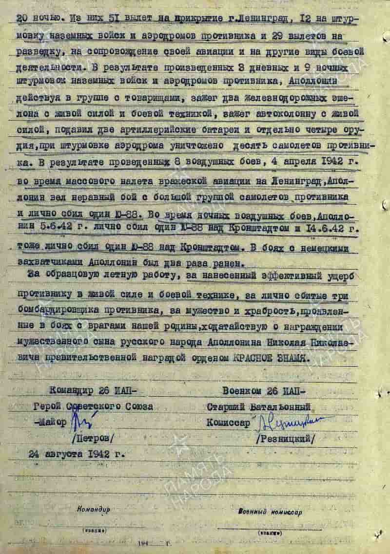 24.08.1942 командир эскадрильи 26 иап ПВО старший лейтенант Аполлонин Н.Н. представлен к награждению и 29.11.1942 награждён орденом Красного Знамени.