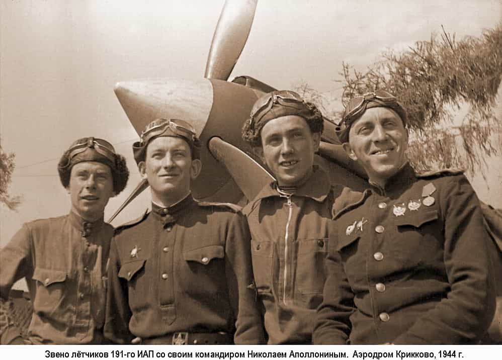 К июню 1944 года заместитель командира эскадрильи 191-го иап гвардии капитан Аполлонин Н.Н. выполнил около 300 боевых вылетов, провёл около 50 воздушных боёв и сбил лично 8 самолётов противника (в наградных документах упиминается и 1 сбитый в группе Ме-109).