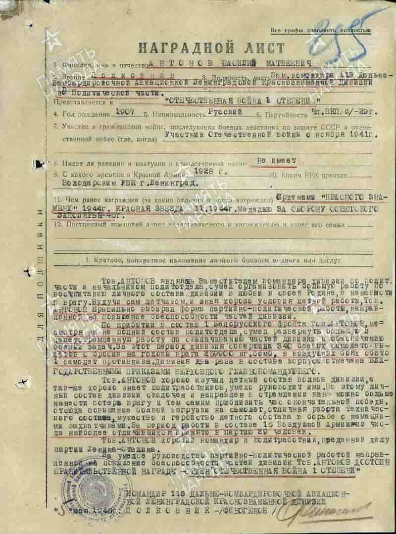 05.05.1945 заместитель командира по политчасти 113-й бад полковник Антонов В.М. представлен к награждению и 10.05.1945 награждён орденом Отечественной войны I степени.