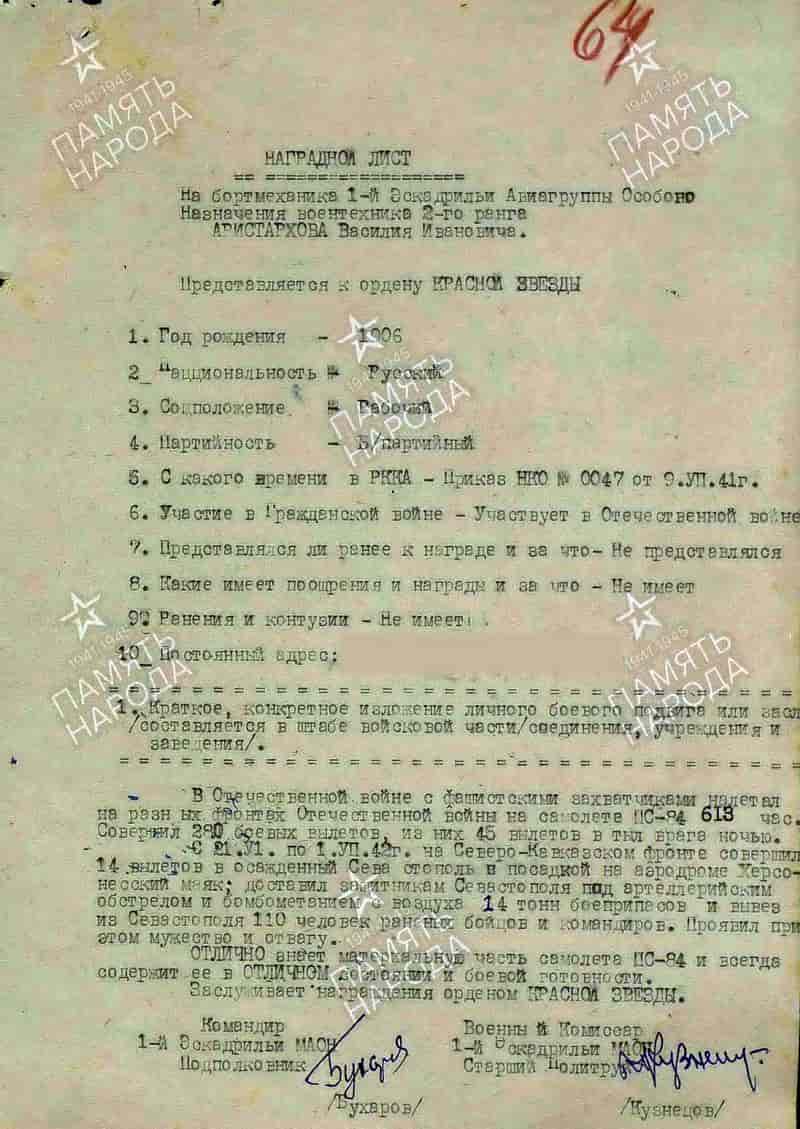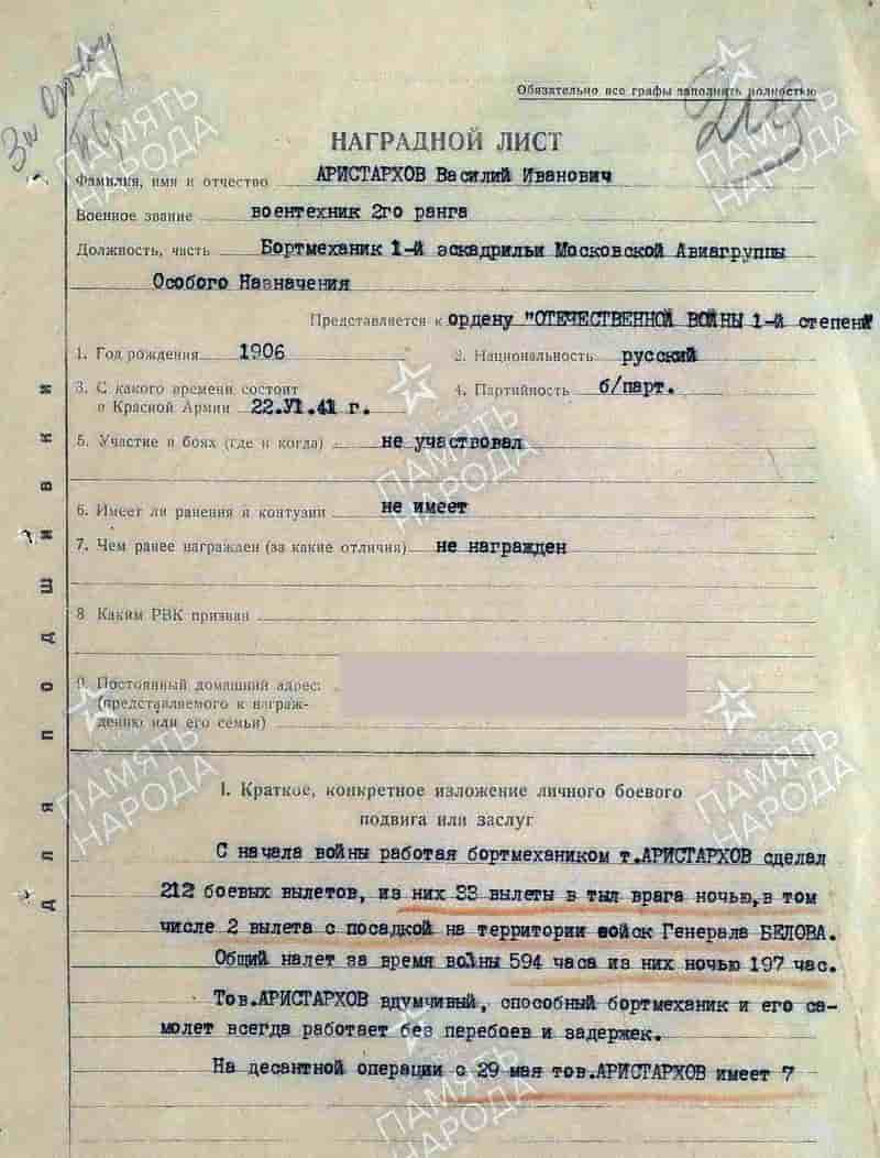 15.07.1942 бортмеханик 1-й эскадрильи МАГОН (5-я ВА Северо-Кавказского фронта) воентехник 2-го ранга Аристархов В.И. представлен к награждению и 21.07.1942 награждён орденом Красной Звезды.
