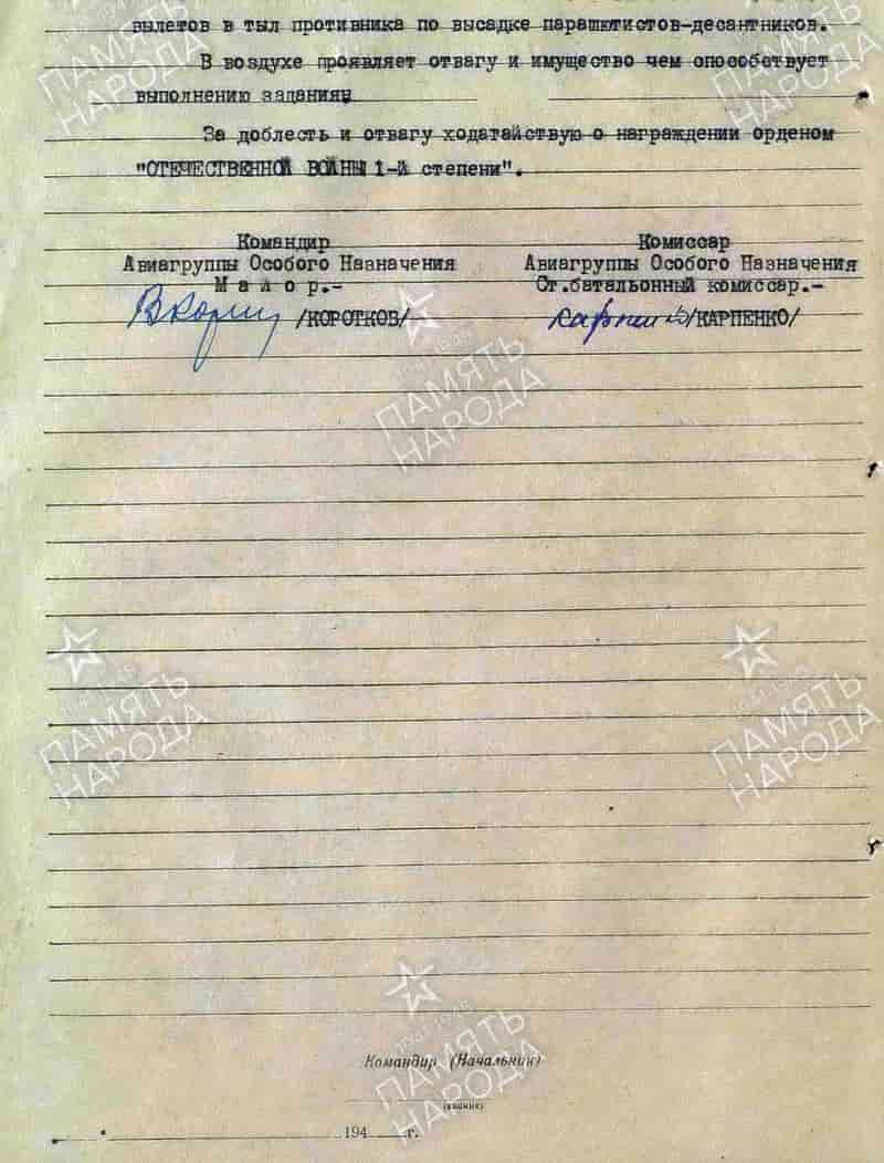 С 03.1943 – бортмеханик 1-й отдельной транспортной эскадрильи Ли-2 Особого отряда (ОСНАЗ) при ГУ ГВФ.