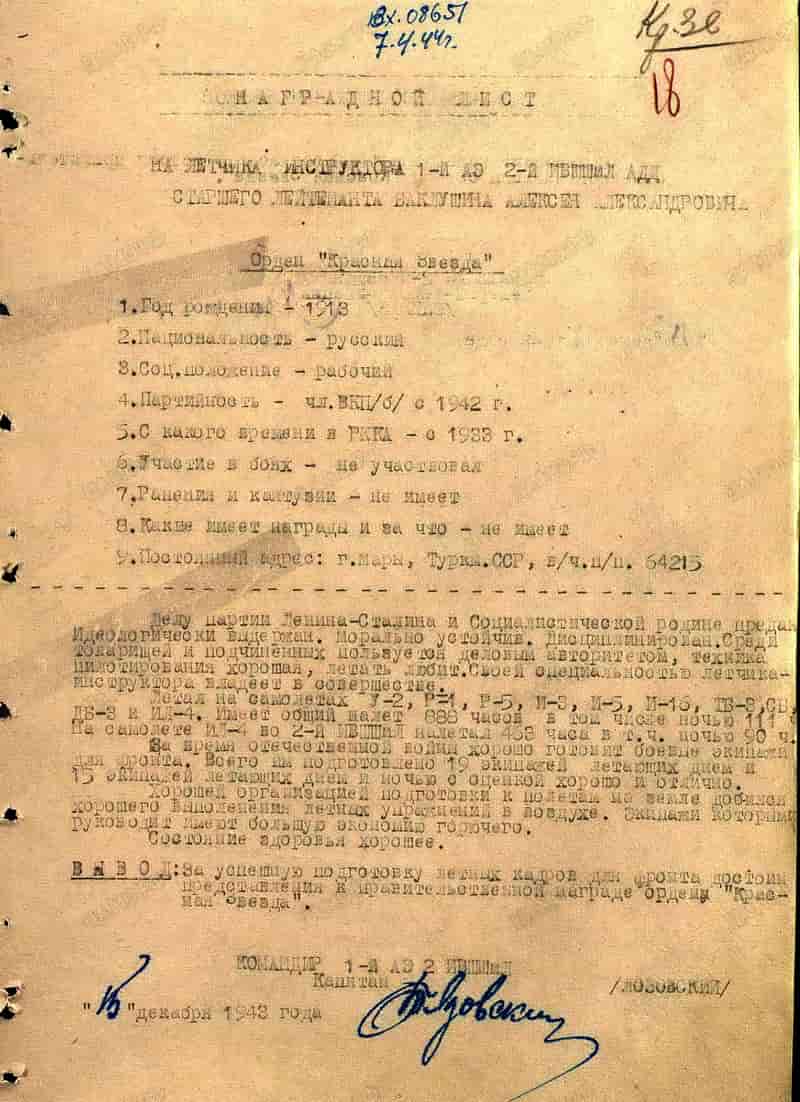 15.12.1943 лётчик-инструктор 1-й эскадрильи 2-й ИВШШИЛ АДД старший лейтенант Баклушин А.А. представлен к награждению и 13.03.1944 награждён орденом Красной Звезды.