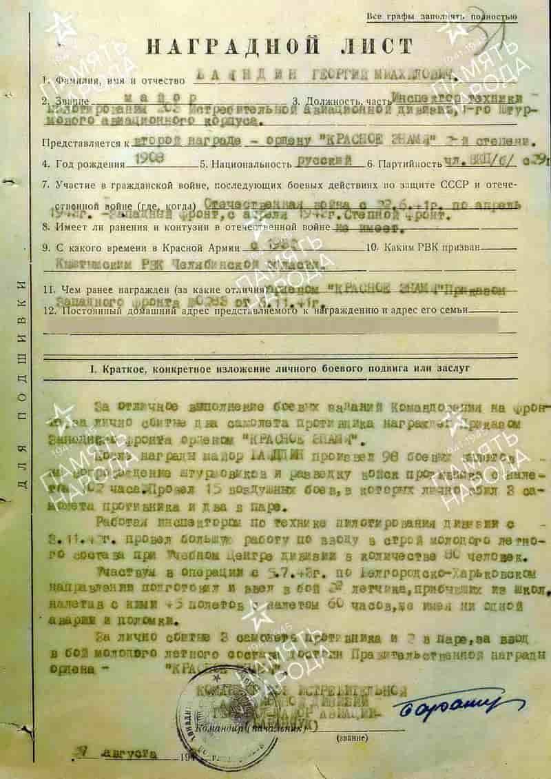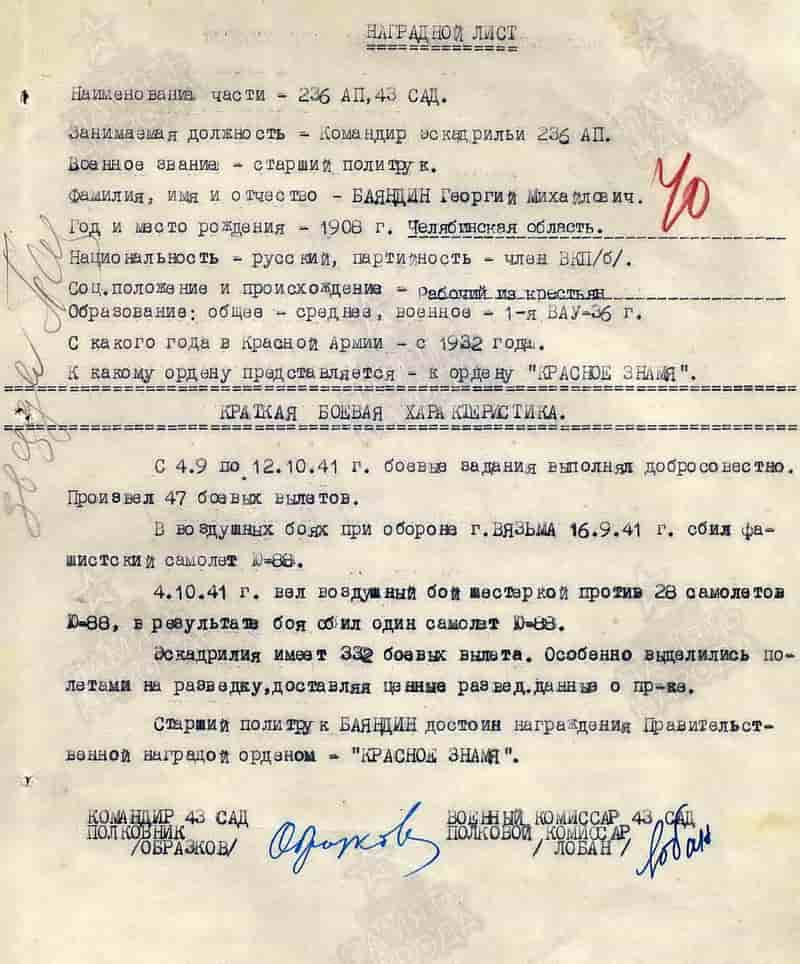 В октябре 1941 года командир эскадрильи 236 иап старший политрук Баяндин Г.М. представлен к награждению и 06.11.1941 награждён орденом Красного Знамени.