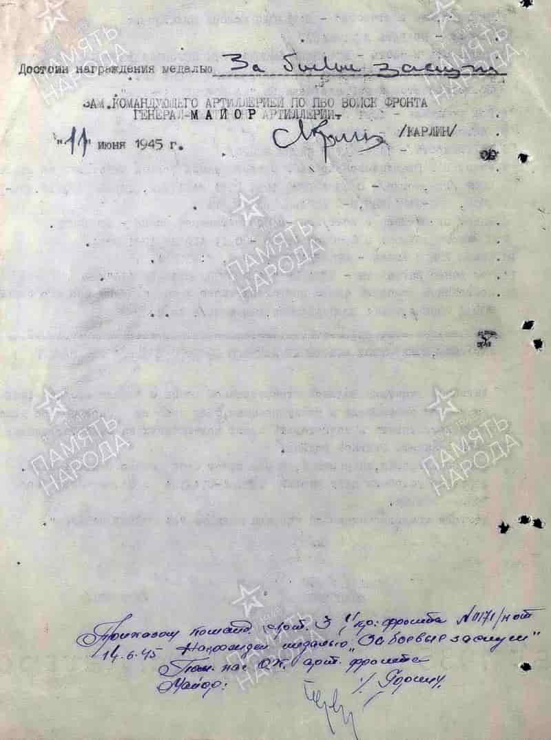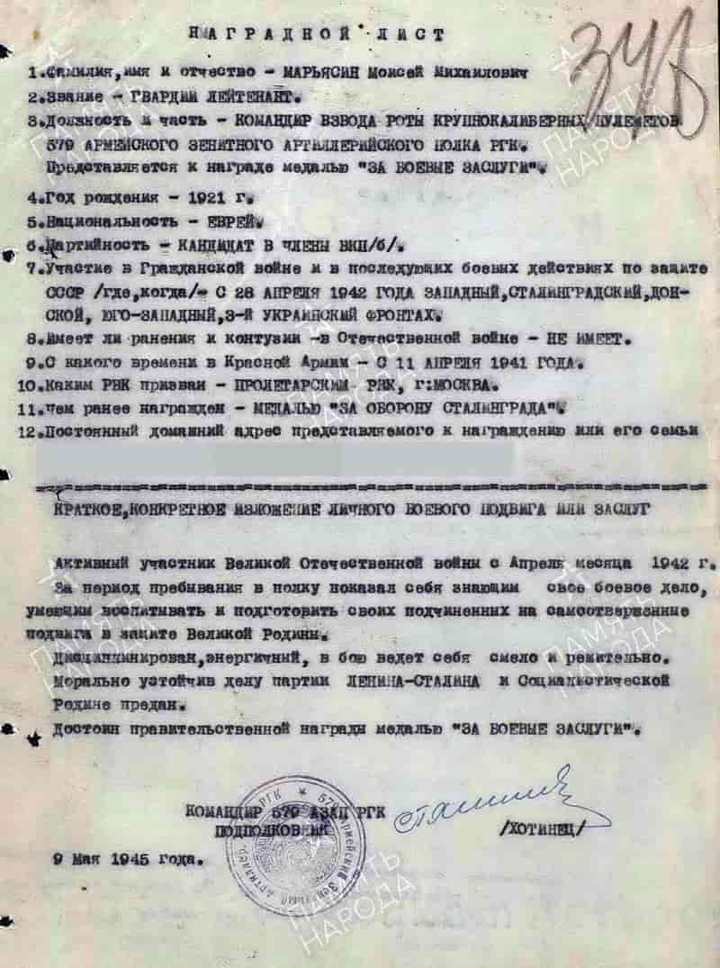 09.05.1945 командир взвода роты крупнокалиберных пулемётов 579 армейского зенитного артиллерийского полка РГК гвардии лейтенант Марьясин Моисей Михайлович представлен к награждению и 14.06.1945 награждён медалью "За боевые заслуги".