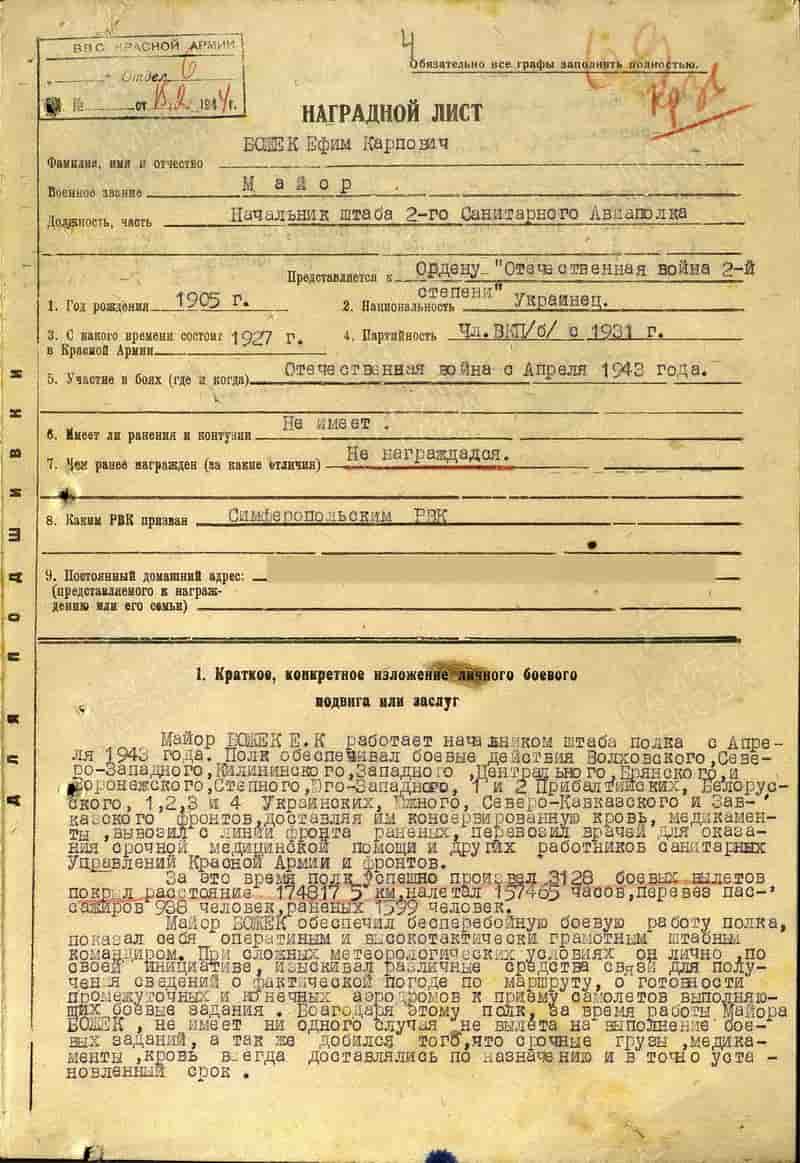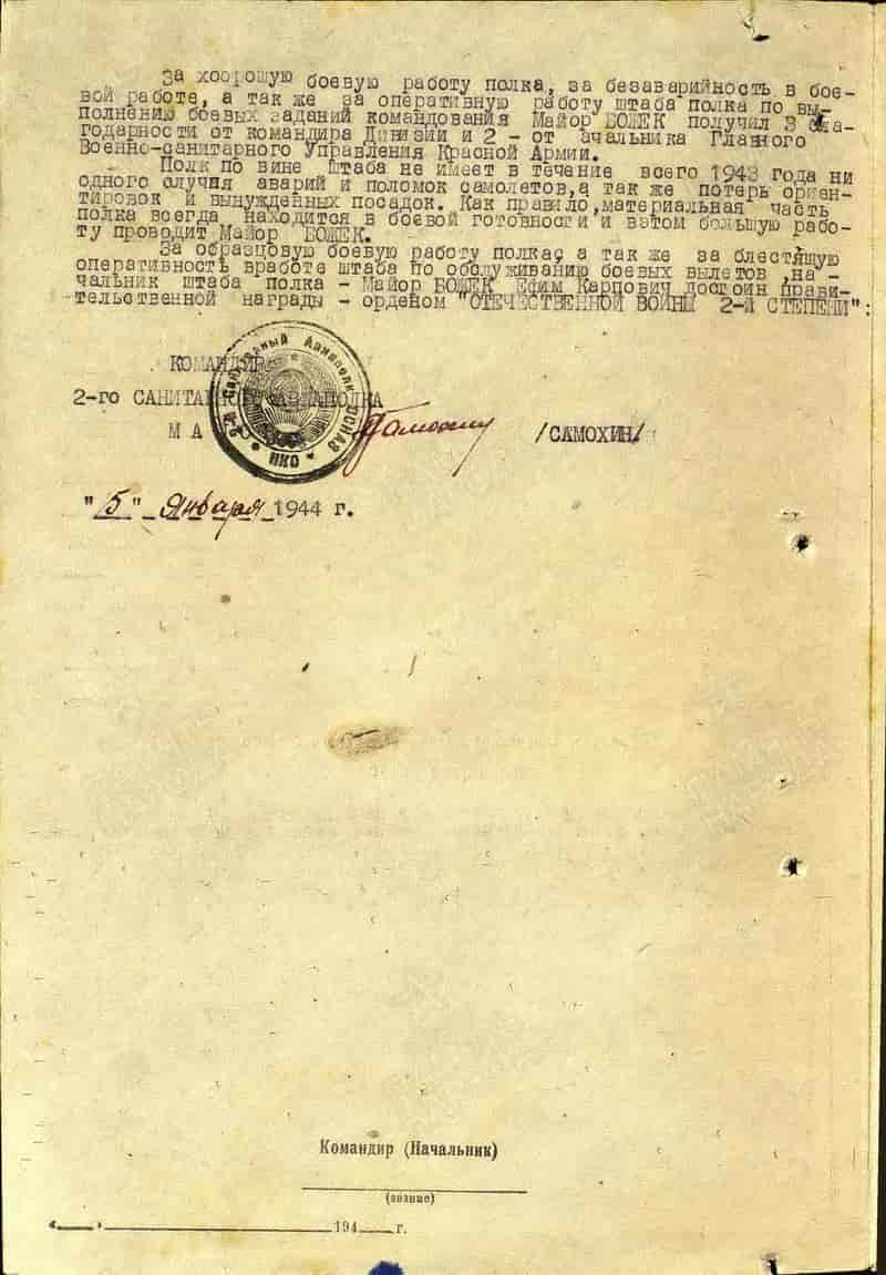 05.01.1944 начальник штаба 2-го санап майор Божек Е.К. представлен к награждению орденом Отечественной войны II степени. 08.04.1944 награждён орденом Красной Звезды.