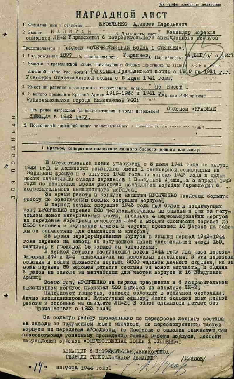 14.08.1944 командир корабля самолёта Ли-2 Управления 6 иак капитан Бронченко А.М. представлен к награждению и награждён орденом Отечественной войны I степени.