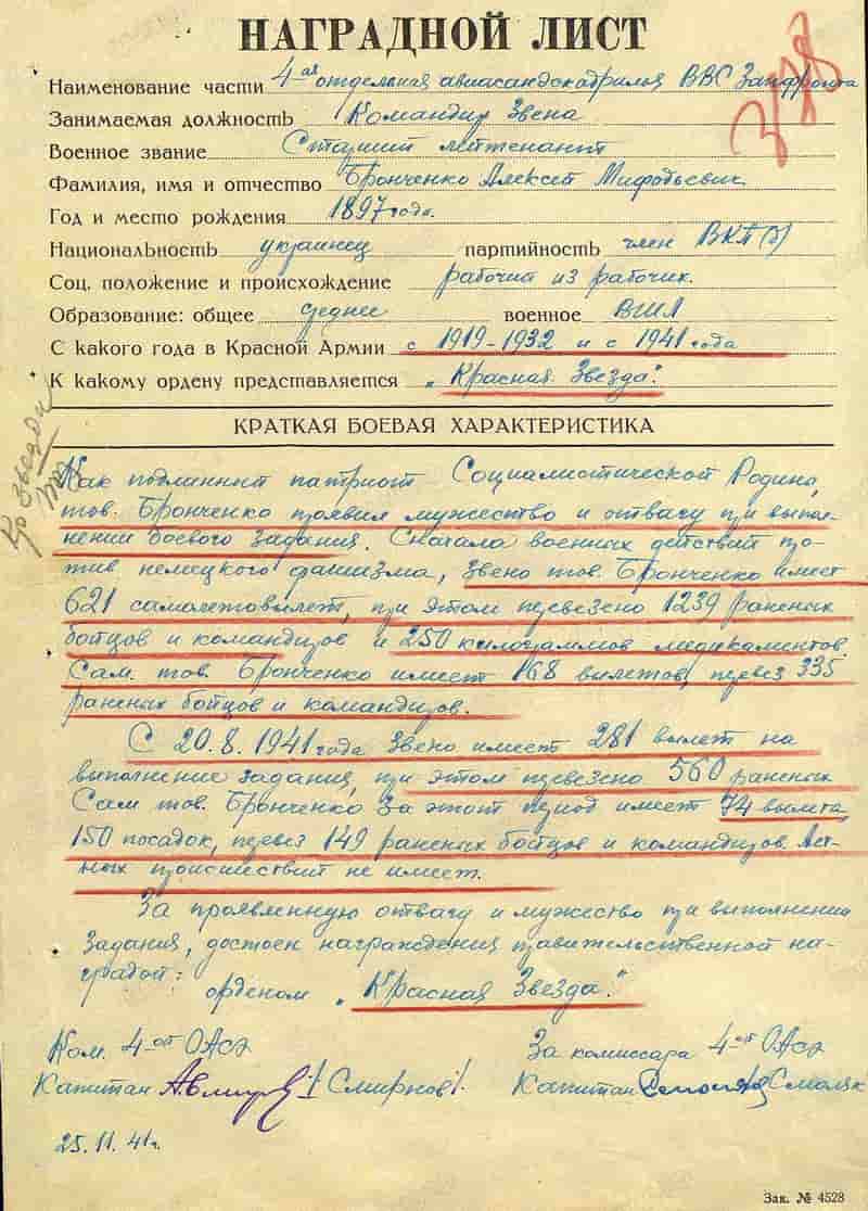 25.11.1941 командир звена 4 отдельной санитарной эскадрильи старший лейтенант Бронченко А.М. представлен к награждению и 06.01.1942 награждён орденом Красной Звезды.