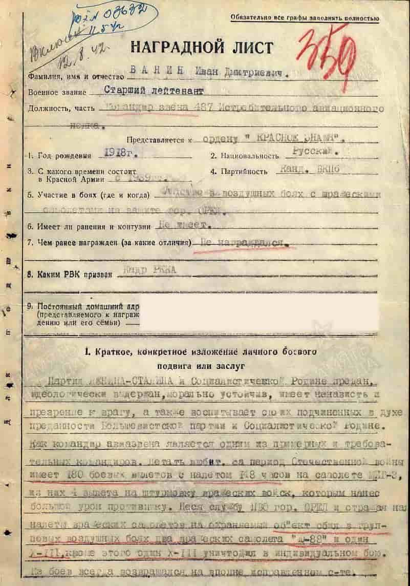 В апреле 1942 года командир звена 487 иап старший(?) лейтенант Ванин И.Д. представлен к награждению орденом Красного Знамени.
