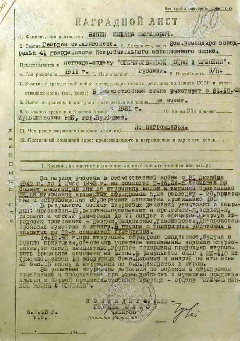 06.07.1943 заместитель командира эскадрильи 41 гиап гвардии старший лейтенант Ванин М.С. представлен к награждению орденом Отечественной войны I степени.