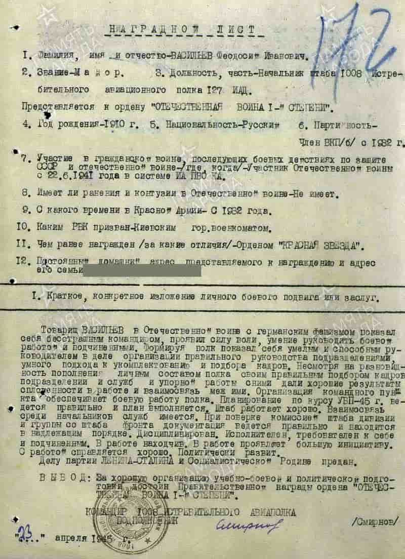 23.04.1945 начальник штаба 1008 иап ПВО 127 иад ПВО Юго-Западного фронта ПВО майор Васильев Ф.И. представлен к награждению орденом Отечественной войны I степени. 29.06.1945 награждён орденом Отечественной войны II степени.