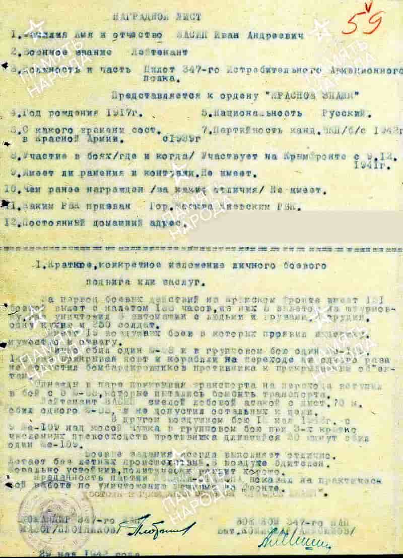 29.05.1942 пилот 347-го иап лейтенант Васин И.А. представлен к награде.