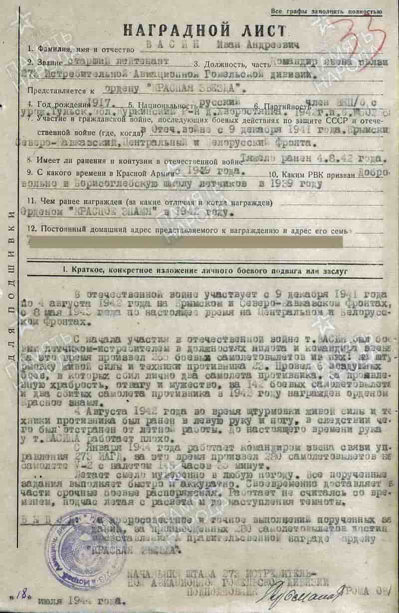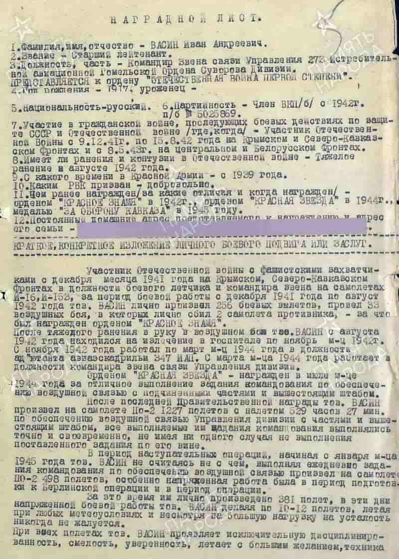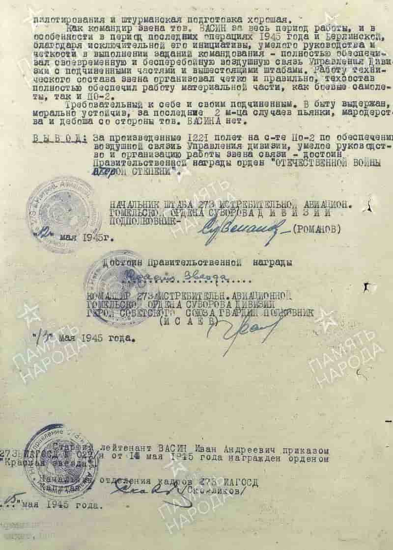 12.05.1944 командир звена связи управления 273 иад старший лейтенант Васин И.А. представлен к награде.