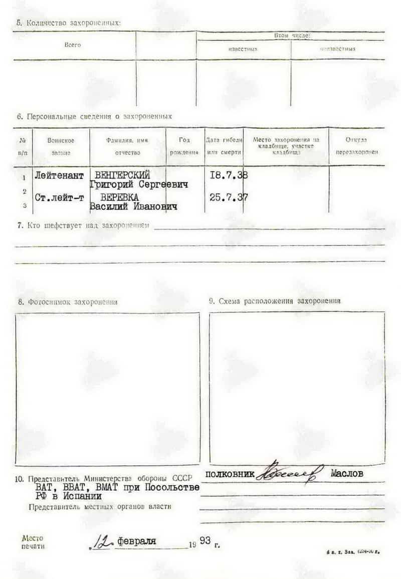 На протяжении более чем полувека родственники Григория не знали обстоятельств его гибели. Единственным документом, который они получили от Наркомата обороны, была короткая справка о том, что лейтенант Венгерский Григорий Сергеевич, выполняя специальное задание командования, 18 июля 1938 года в бою пропал без вести. Чуть больше сказано в бумагах, полученных его близкими в 1999 году. Минобороны РФ и Российский государственный военный архив сообщили: «Лейтенант Венгерский Григорий Сергеевич с 10 июня 1937 года находился в Испании в должности командира звена 2-й эскадрильи 56-й истребительной авиабригады. 18 июля 1938 пропал без вести в Испании». Обе справки заканчивались стандартной фразой: «Другими сведениями о нём не располагаем».
