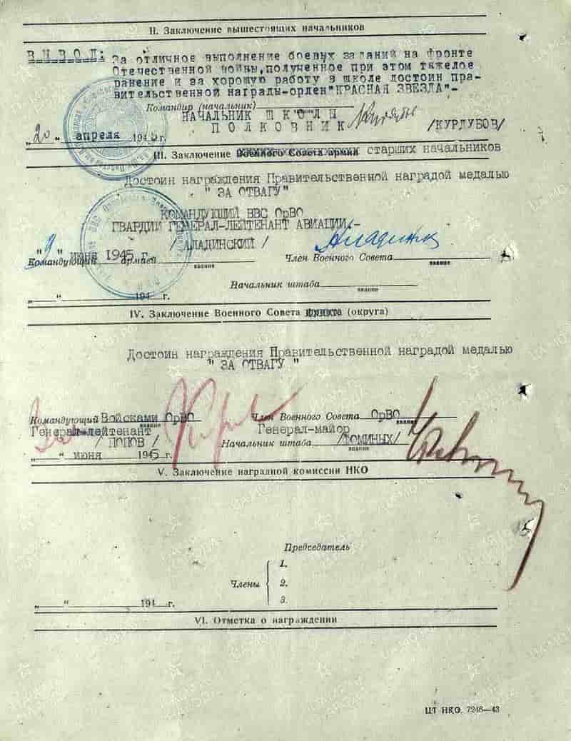 20.04.1945 командир взвода Борисоглебской ВАШП лейтенант Гаврилов Б.И представлен к награде и 20.02.1946 награждён медалью «За отвагу».