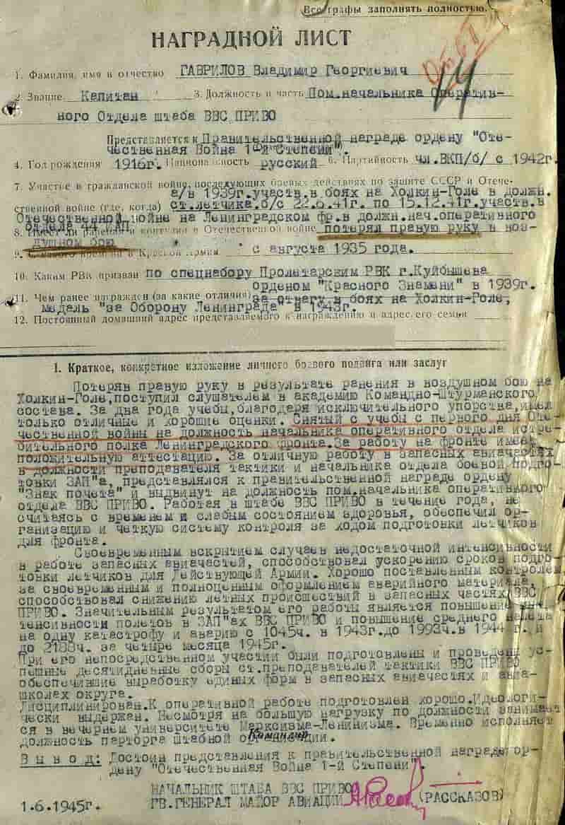 01.06.1945 помощник начальника оперативного отдела штаба ВВС Приволжского ВО капитан Гаврилов В.Г. представлен к награждению орденом Отечественной войны I степени. 23.06.1945 награждён орденом Отечественной войны II степени.