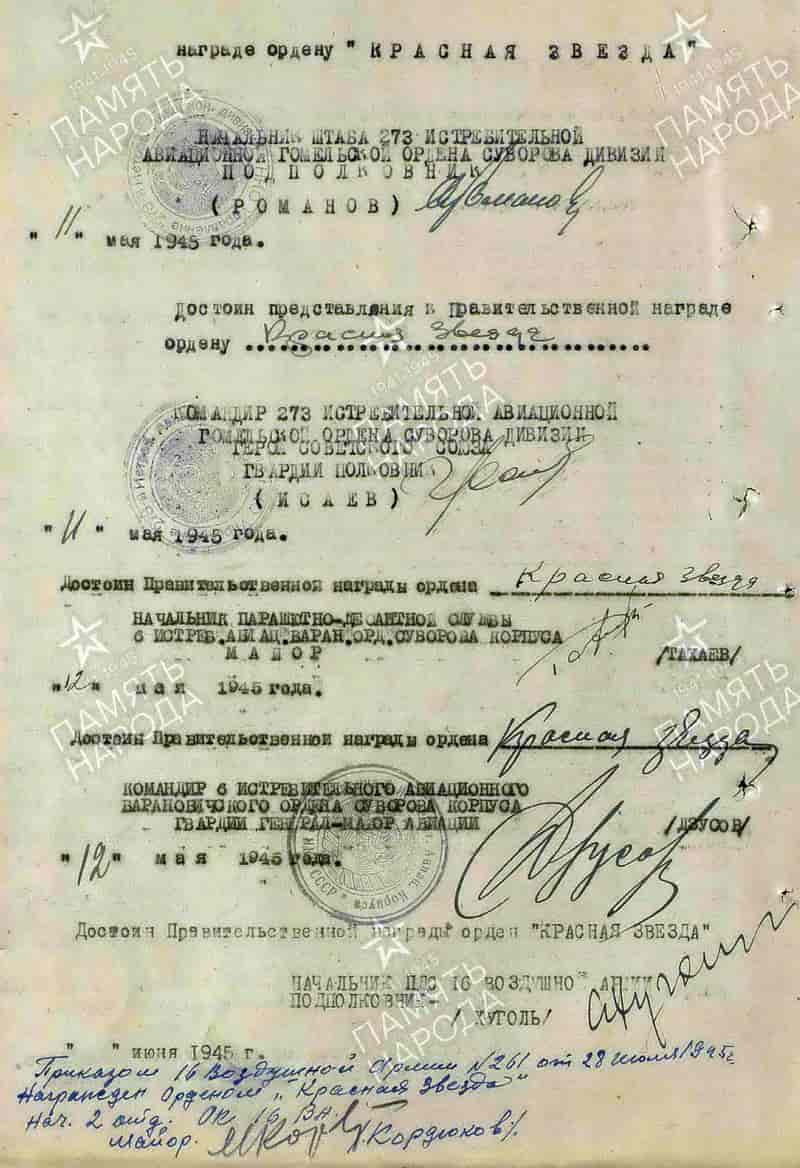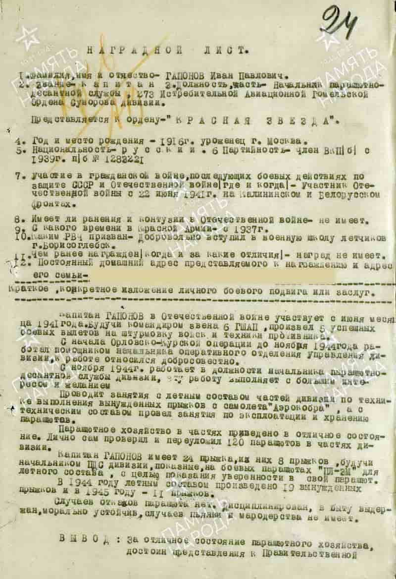 11.05.1945 начальник парашютно-десантной службы 273 иад капитан Гапонов И.П. представлен к награде.