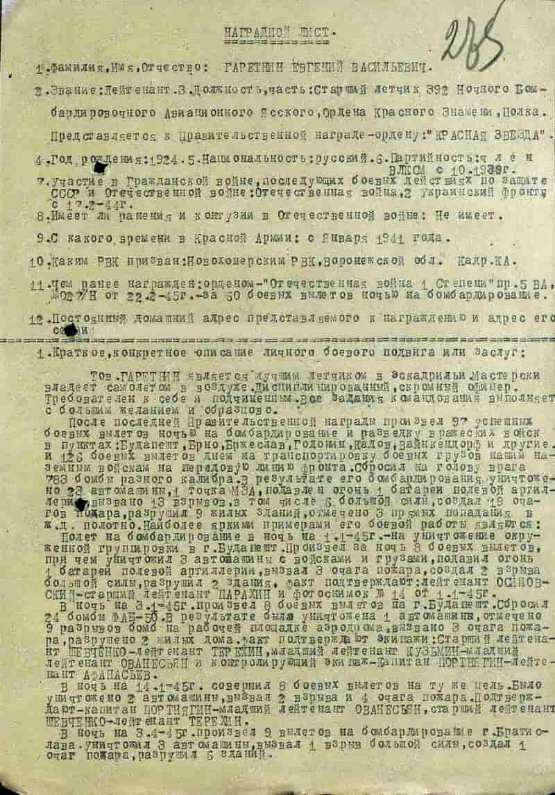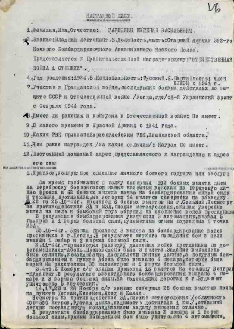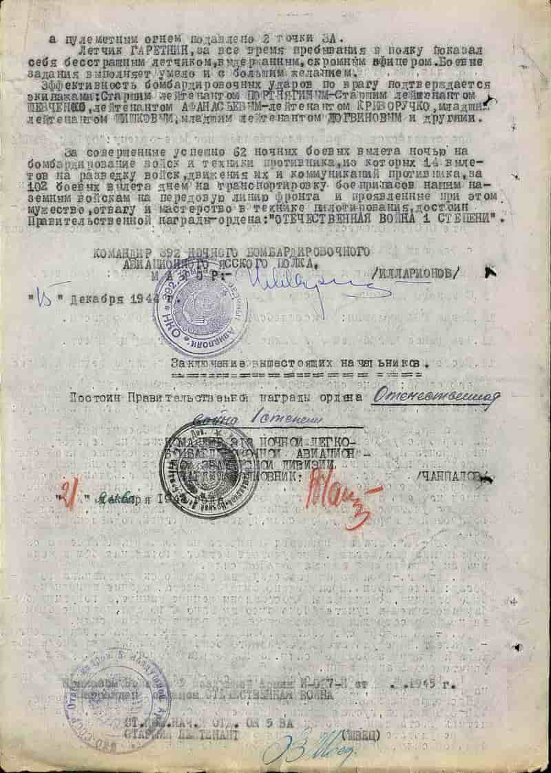 15.12.1944 старший лётчик 392-го нлбап младший лейтенант Гаретнин Е.В. представлен к награде и 22.02.1945 награждён орденом Отечественной войны I степени.