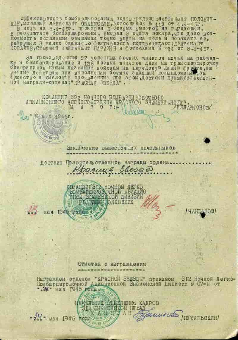 20.05.1945 старший лётчик 392-го нлбап лейтенант Гаретнин Е.В. представлен к награде и 24.05.1945 награждён орденом Красной Звезды.