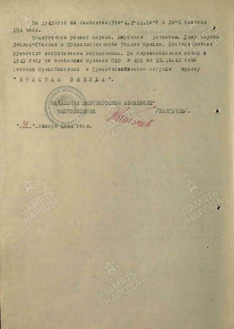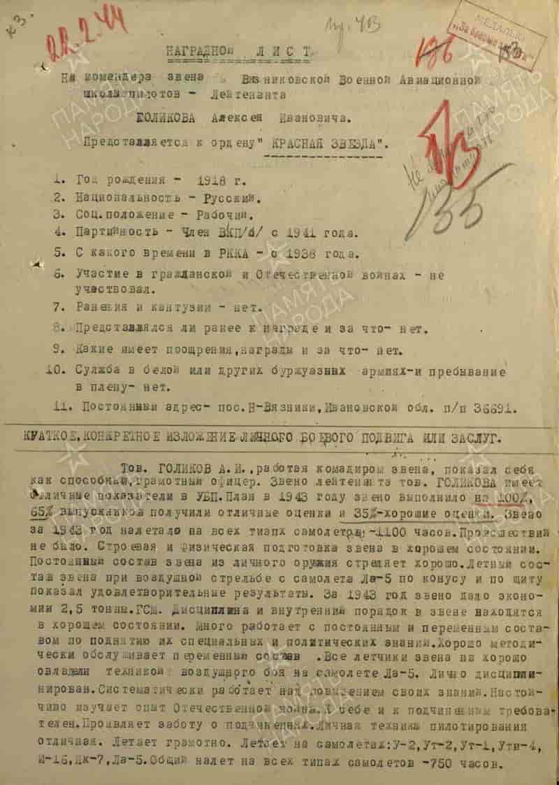 31.01.1944 командир звена Вязниковской ВАШП лейтенант Голиков А.И. представлен к награждению орденом Красной Звезды. 02.08.1944 награждён медалью «За боевые заслуги».