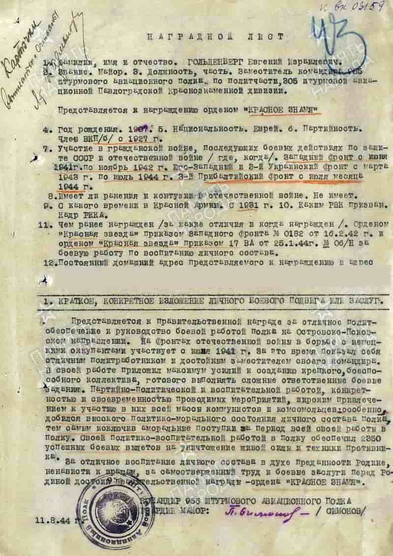11.08.1944 заместитель командира по политчасти 955-го шап 305 шад 14 ВА 3-го Украинского фронта майор Гольденберг Е.И. представлен к награде и 09.10.1944 награждён орденом Красного Знамени.