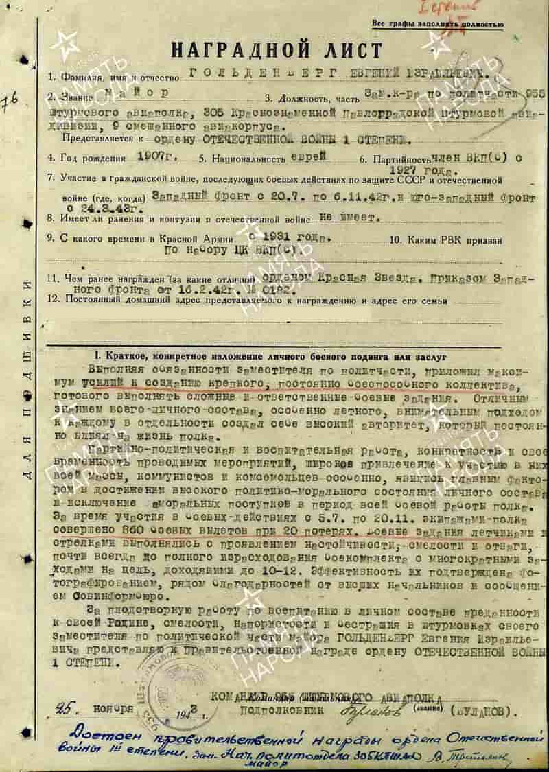 25.11.1943 заместитель командира по политчасти 955-го шап 305 шад 9 сак 17 ВА 3-го Украинского фронта майор Гольденберг Е.И. представлен к награждению орденом Отечественной войны I степени. 25.01.1944 награждён орденом Красной Звезды.