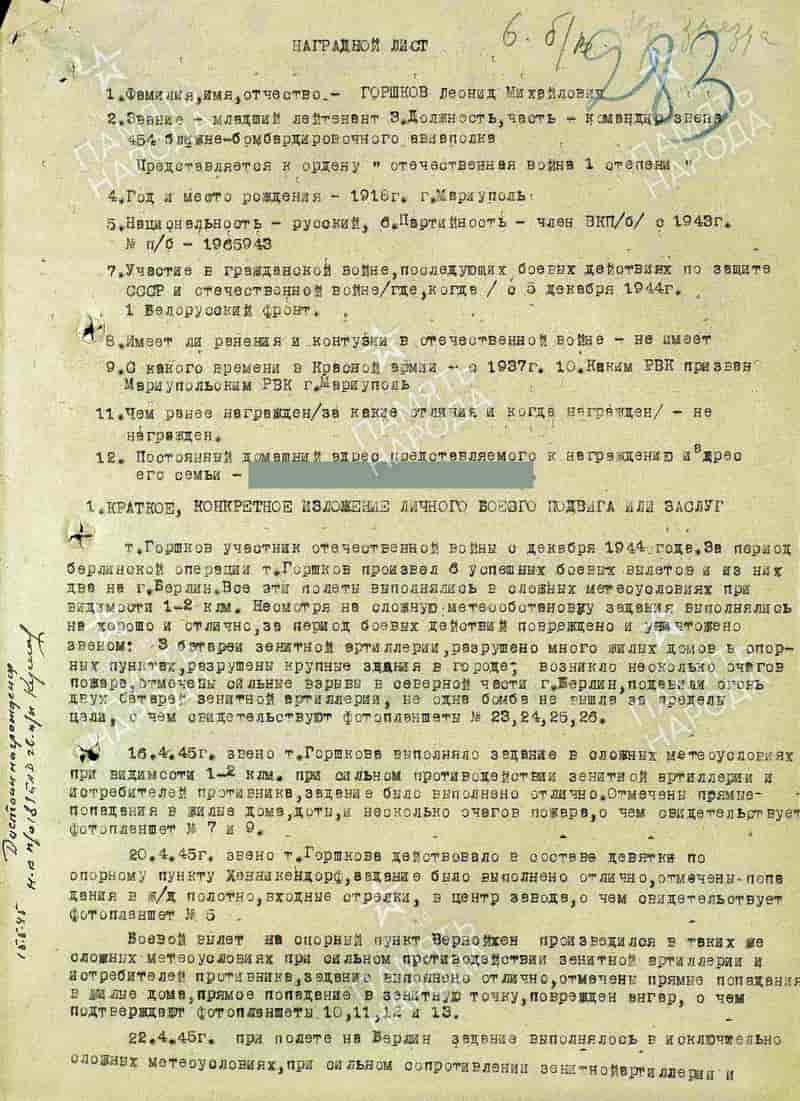 12.05.1945 командир звена 454-го бомбардировочного авиационного полка 183 бад 3 БАК младший лейтенант Горшков Л.М. представлен к награждению орденом Отечественной войны I степени. 21.06.1945 награждён орденом Красной Звезды.