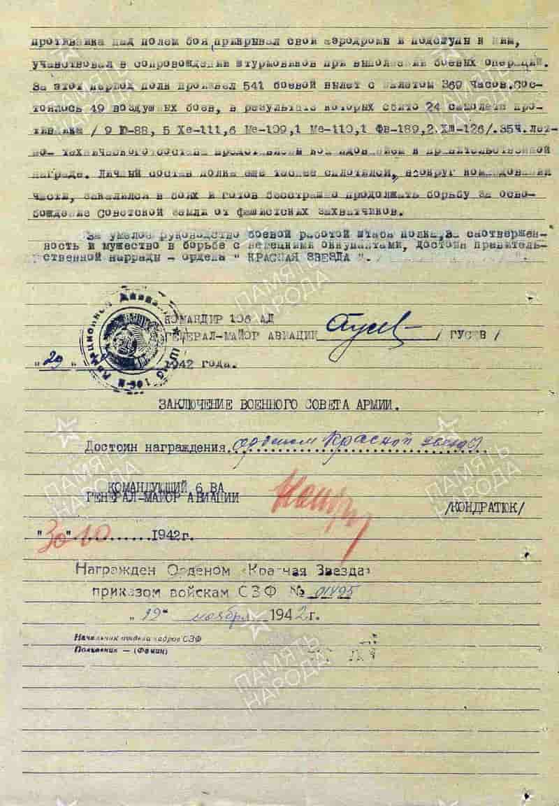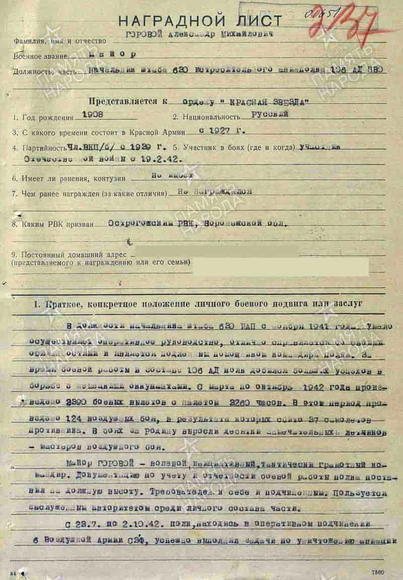 29.10.1942 начальник штаба 630 иап ПВО майор Горовой А.М. представлен к награде и 19.11.1942 награждён орденом Красной Звезды.