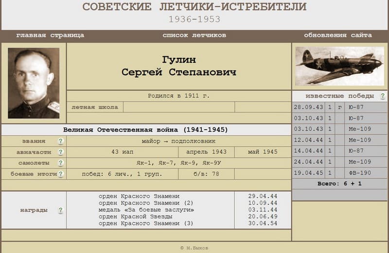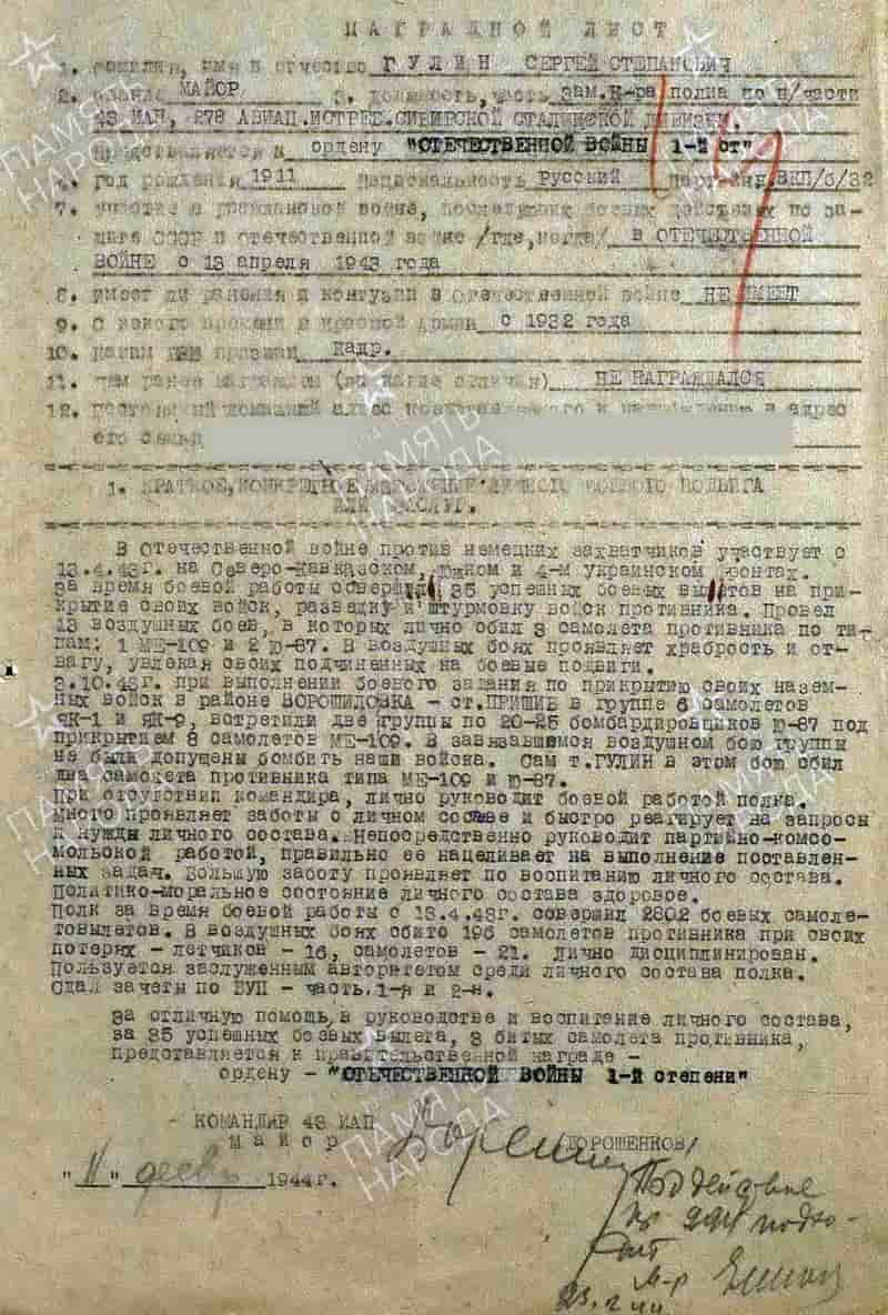 Всего за два года Великой Отечественной войны подполковник С.С. Гулин выполнил 178 боевых вылетов, лично сбил 6 немецких самолётов и 1 в составе группы.