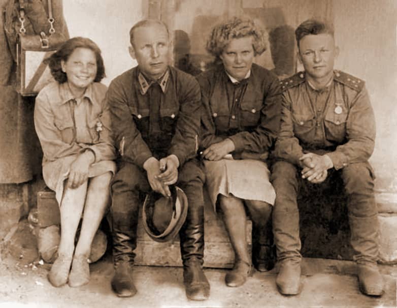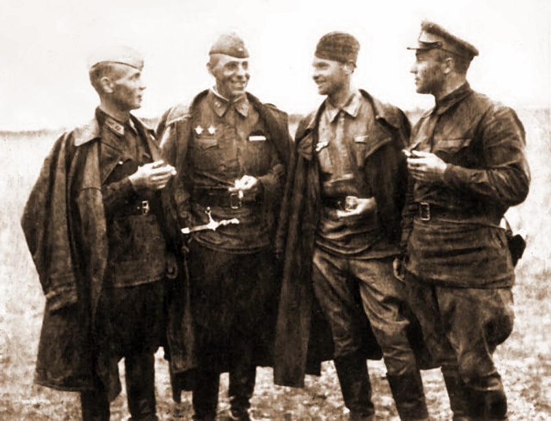 Слева направо: заместитель командира полка по политической части майор С.С. Гулин, старший инженер полка инженер-майор Н.С. Шустерман, штурман полка капитан Н.Г. Волчков, командир полка майор А.А. Дорошенков